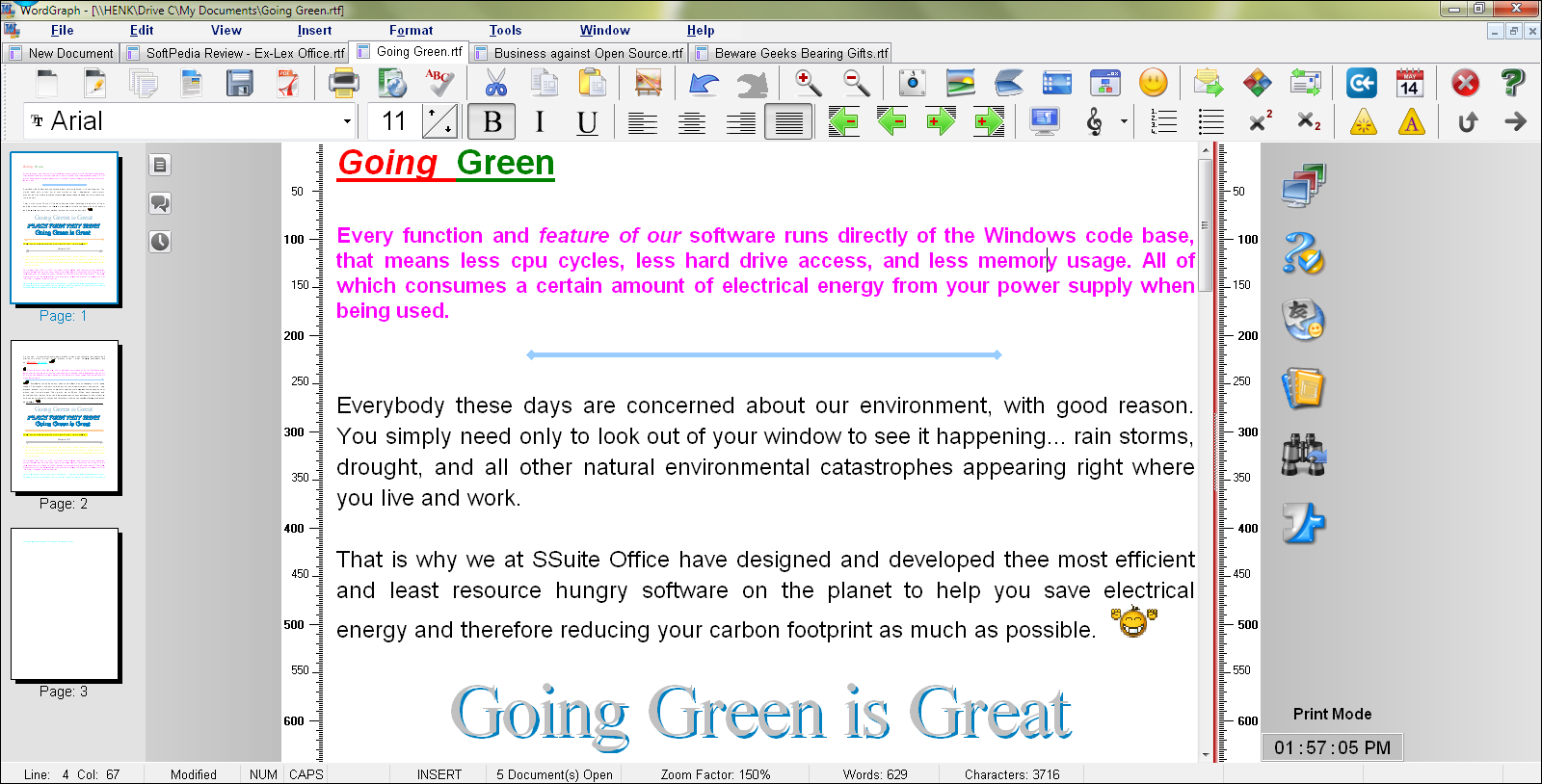 A number of available features give you a fine degree of control over the formatting of text, pages, sections of documents, and also entire documents in WordGraph. You may also save your documents in a variety of industry standard formats and even export them to pdf, jpg, bmp, png, gif, and our own presentation format ssp. Document compatibility with MS Office - { rtf, doc, txt, rtc, pdf }