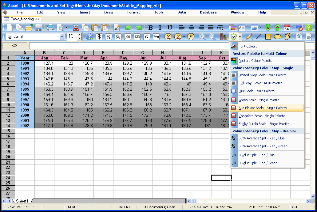 Below are two examples on how to use choropleth value intensity colour mapping with Accel spreadsheet.