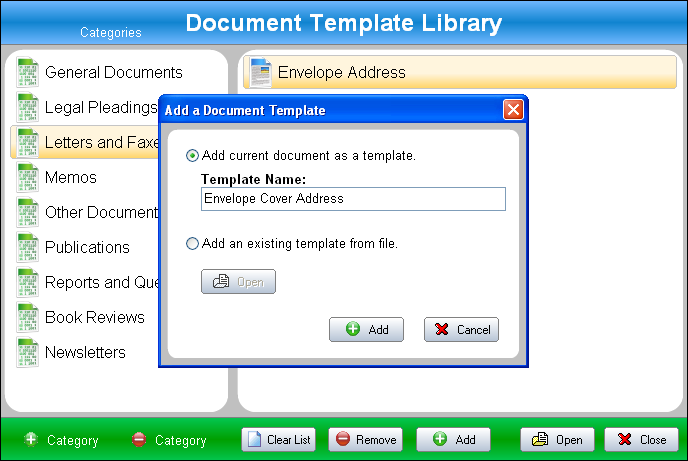 To add your newly created envelope example to the Template Library, just click on the template library button on the right-hand side of the main page, or just go to the main menu and click on "File >> Template Library" to open the main window like the image below.